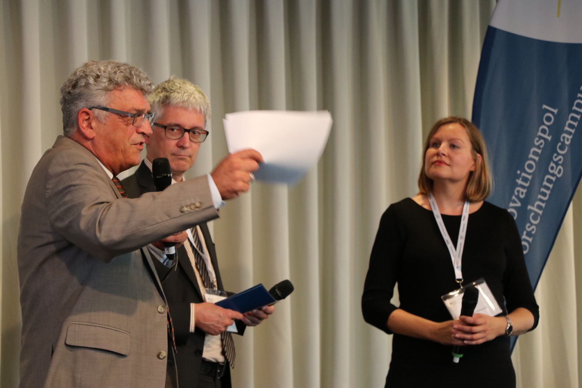 Im Rahmen der Fachtagung fand das Finale des ersten Science Slams der Förderinitiative statt. Hier präsentierten die drei Nachwuchskräfte, die sich in einem Vorentscheid am Vortag aus insgesamt 14 Science-Slam-Beiträgen durchsetzen konnten, ihre Forschungsthemen auf originelle Weise. Sie überzeugten das Publikum jeweils in den Kategorien „Medizin“, „Produktion“ sowie „Energie und mathematische Modelle“.