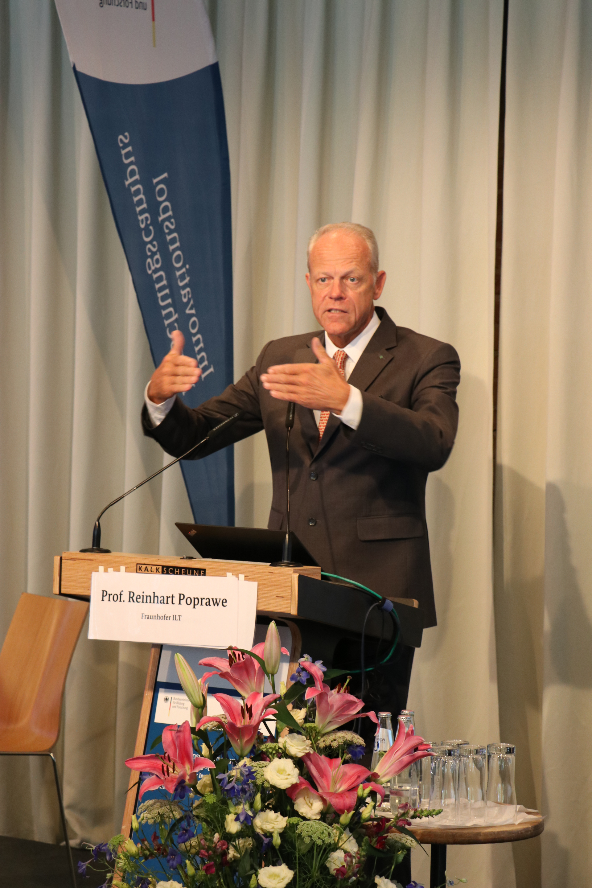 Inwiefern das Innovationsmodell Forschungscampus durch sein Alleinstellungsmerkmal – Wissenschaft und Wirtschaft arbeiten besonders gut vernetzt und ressourcenstark unter einem Dach zusammen – auch eine neue Kultur prägen kann, diskutierten die Gäste aus Politik, Wissenschaft und Wirtschaft: Herr MinDirig Engelbert Beyer (Leiter der Unterabteilung für Grundsatzfragen, Innovation im BMBF), Frau Prof. Dr. Ellen Enkel (ZU Friedrichshafen) Herr Prof. Dr. Reinhart Poprawe (Forschungscampus DPP, Fraunhofer ILT), Herr Dr. Stefan Sauer (Geschäftsführer SICP, Universität Paderborn) sowie Herr Dr. Stefan Röll (Forschungscampus STIMULATE, Neoscan Solutions GmbH). Moderiert hat Wissenschaftsjournalist Andreas Lange.